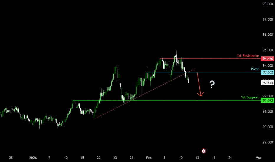 NZD/JPY has broken out of the pivot, which acts as an overlap support, and could drop to the 1st suppor,t which is also an overlap support.
