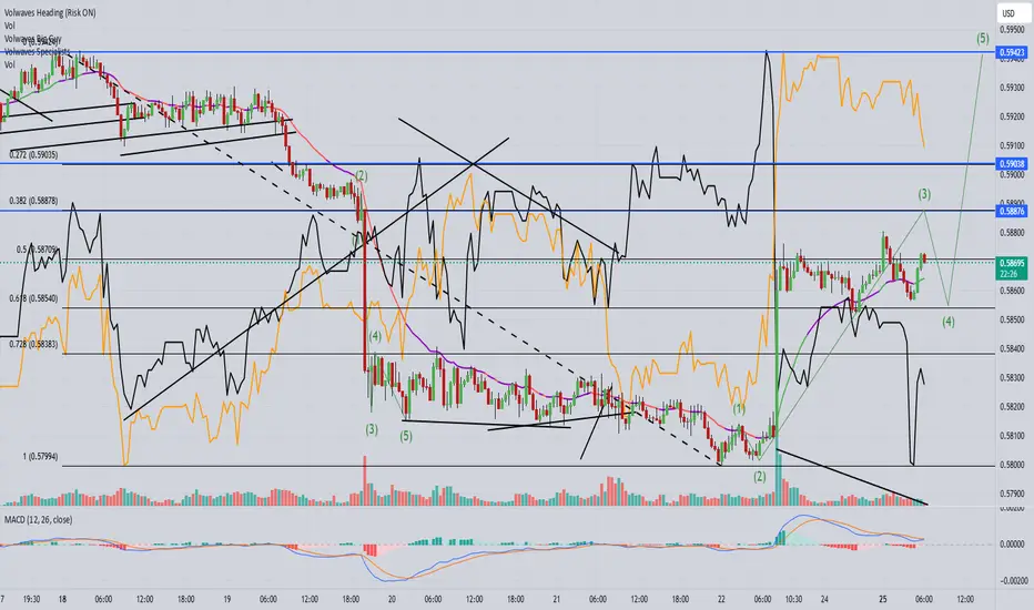 1). Wave 5 drops deeper very likely ending southern correction! 2). Risk is now in BUY" mode! 3). Volume is building with long positions! 4). Price appears to be heading towards higher market sentiment! 5). Powell puts interest rate cuts back on the table!