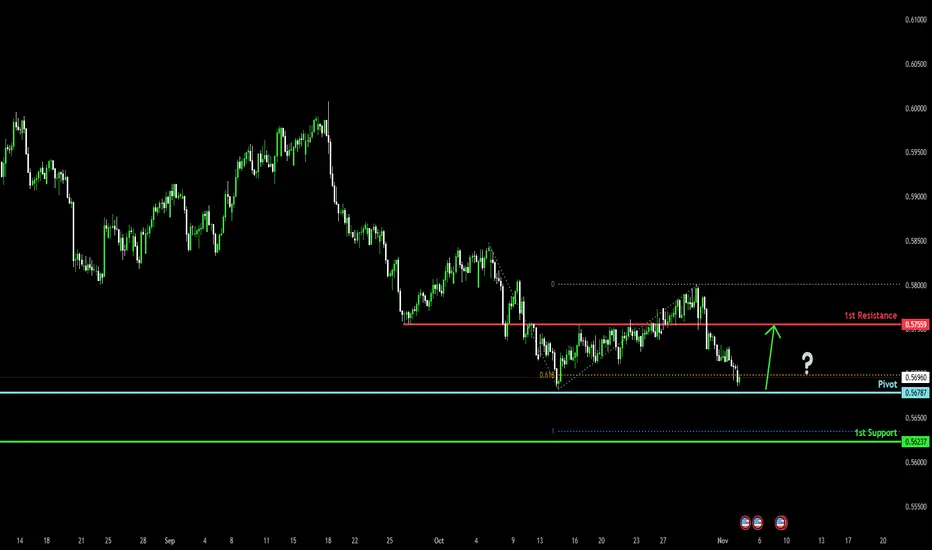 The Kiwi (NZD/USD) is falling towards the pivot and could bounce to the 1st resistance.