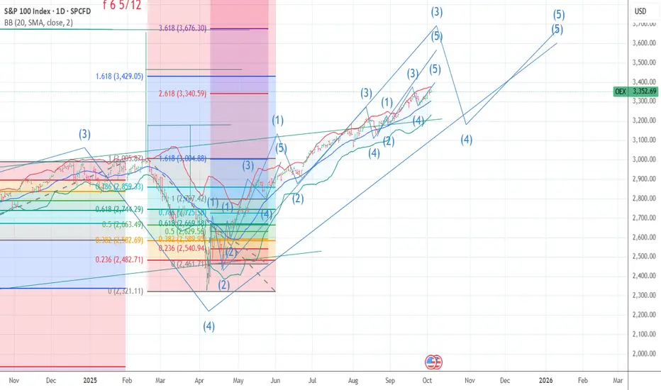The chart posted is the SP 100 index this is a true reflection of what I see as the wave structure since my call at the low April 7th for wave 4 . I see a sharp panic nearing into oct 10 to the 20th with an outside chance 11/2/4 What I see is a drop of .238 to .382 from the low of April 21 wave 2 low . I have moved back and forth and in and out of puts along the way . I am 90 % short once again and Will be 100 % by close today .The 4 fiur spirals came in and due 9/27 plus minus 3 days .I am looking for A panic for wave 4 from there I will look for the final 5th wave due 1/10to 1/27 and then see a drop of well over 30% into oct 2026 into the 4 year cycle low .Best of Trades WAVETIMER