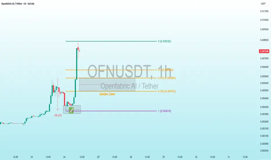 OFN captures a dramatic -28.6% plunge in Openfabric AI against USDT on the 1-hour timeframe! 🚨 The price rockets down from a high of ~0.0062 to a low of 0.004018, smashing through the shaded "Golden Zone" support area (roughly 0.005-0.006). Key horizontal lines highlight resistance at 0.00692 (orange) and deeper supports like 0.005068 (yellow), with volume spiking massively during the red candle dump—signaling heavy selling pressure! 💥