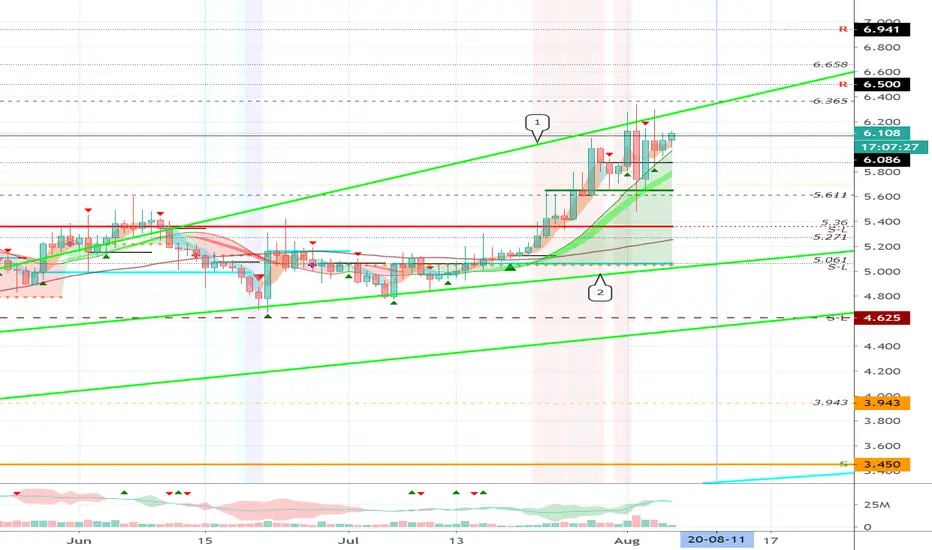 If you get support at the 6.086 point, you are likely to rise above the uptrend line (1).