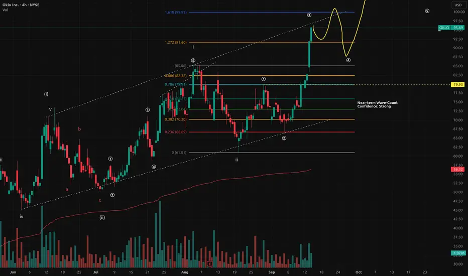 OKLO is on the precipice of $100 a share, and on the heels of a rather volatile move up. The nuclear industry as a whole has been taking off over the last week. Looking for a mini-expanded flat to contradict the zig-zag we had on wave 1-2.