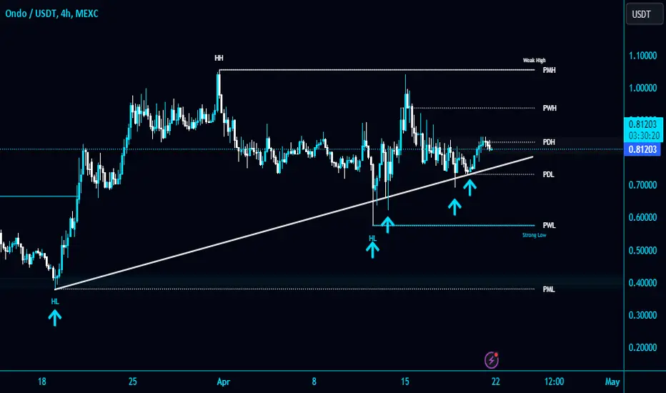ONDO needs to hold this trendline to remain bullish. #ONDOUSDT's first local resistance level is PWH $0.936 & PMH $1.0556. The support level is PWL $0.5723.