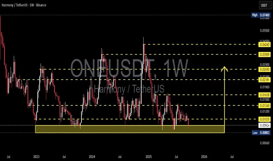 Harmony (ONE) is currently sitting at a make-or-break level. On the weekly chart, price has reached the critical demand zone at 0.0080 – 0.0103 USDT (yellow box). This area has been tested multiple times since 2023, making it both a strong historical support and a fragile level under constant pressure.