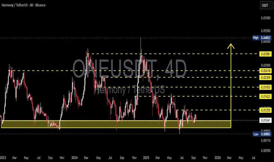 Harmony (ONE) is once again testing the multi-year support zone at 0.0078 – 0.0105 USDT, a level that has held the market multiple times since 2023. This zone acts as the last line of defense for the bulls, and the reaction here will determine whether we see a new accumulation phase or a deeper bearish continuation.