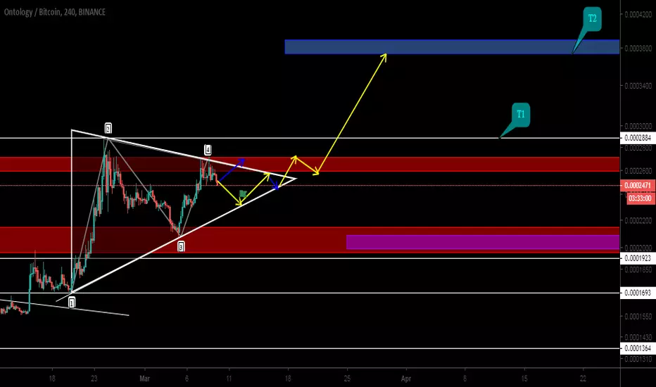 Here's a sweet Symmetrical Triangle, waves indicated by arrow and Target given by T1 and T2. Mostly chances are with upside breakout...