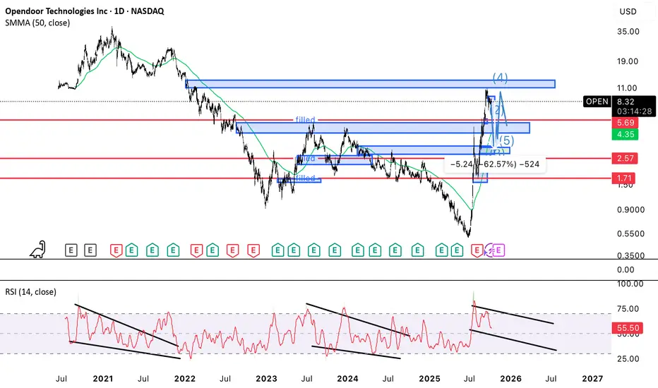 this is what i see for open door, rsi is high i would short or buy 3-4 month options to put