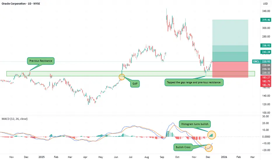 Oracle has successfully retested and reclaimed a major former resistance zone, which now acts as a strong support area on the daily chart.