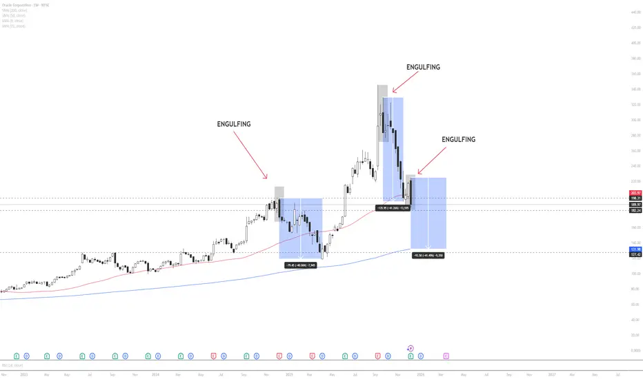 A key technical development is the appearance of a weekly bearish engulfing candle, a pattern that historically precedes sharp downside moves in ORCL.