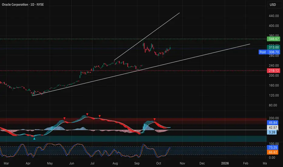 The macro structure remains firmly bullish. Price is currently retesting the prior breakout area around $306โ$313, sitting just beneath the upper channel resistance at $322โ$325. The higher-timeframe chart suggests the recent correction phase is ending, and a continuation pattern is forming.