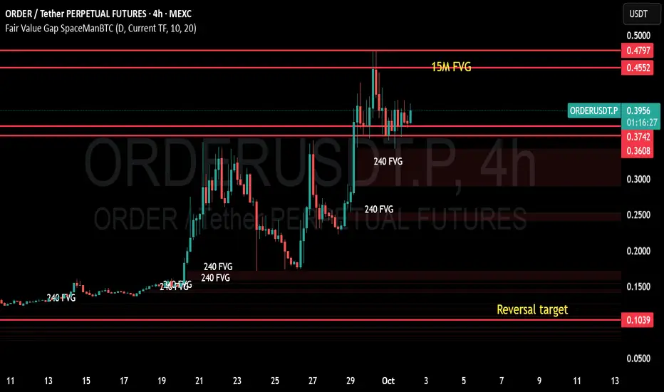 Analyzing the current price action of ORDERUSDT.P suggests a possible reversal, with expectations of a retracement back to the 10-cent level. Notably, a bottomless wick on the 4-hour candle at this level indicates strong support. Additionally, a Fair Value Gap (FVG) below the current price reinforces the likelihood of a return to that zone. The market typically seeks to fill FVGs above the current price, which aligns with this potential move.