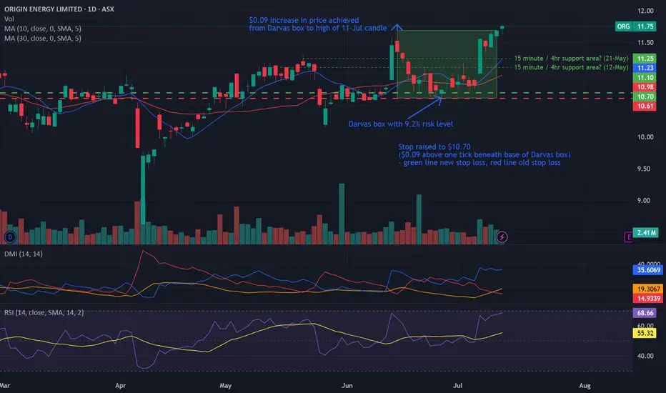 UPDATE (week ending 11-Jul): Trade activated on 11th July, albeit on moderate volume, with the share price closing above both 10 and 30 day MA's at the end of the trading week. Newer high of $11.78 formed during the week ($0.09 above the previous high), with suggestion to raise protective stop $0.09 higher to $10.70 ($0.09 above one tick beneath Darvas box).Note