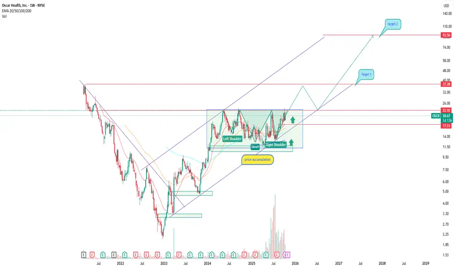 Oscar Health (NYSE: OSCR) is emerging as one of the more interesting names in the U.S. healthcare insurance sector. After an extended accumulation phase, the stock has broken out and is now trading above its major EMAs (50/100/200), confirming a structural shift toward a bullish trend.