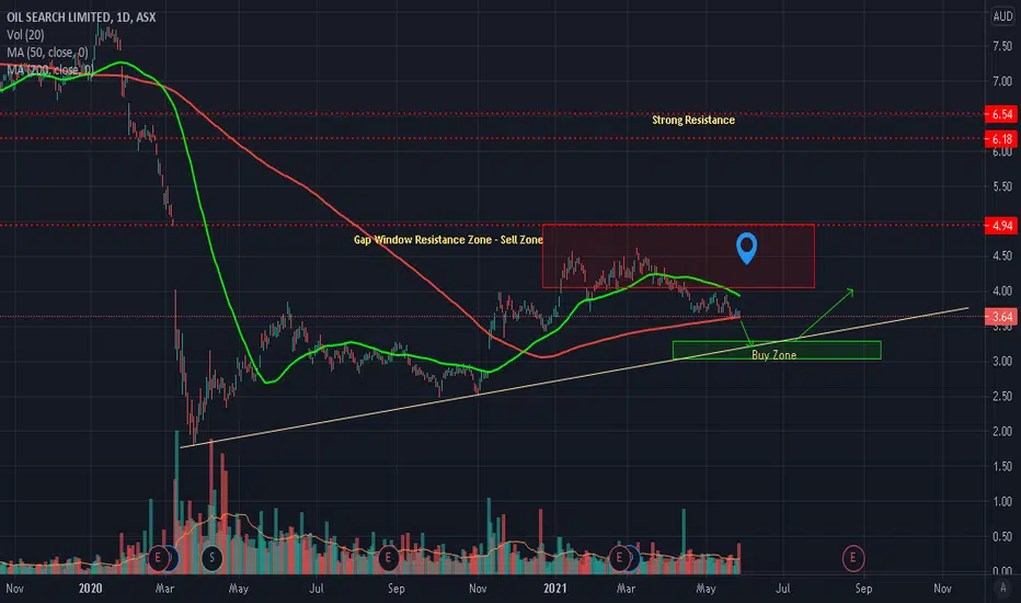 OSH has rallied nicely due to increase in Oil prices but now it is pulling back. It was unable to continue higher and now I am expecting it to reach my Buy Zone around $3.20, which is also trendline Support and POC of Volume profile. I shall monitor when price reaches my Buy Zone between $3.00 - $3.20, where I would take long positions after Bullish Price Action.