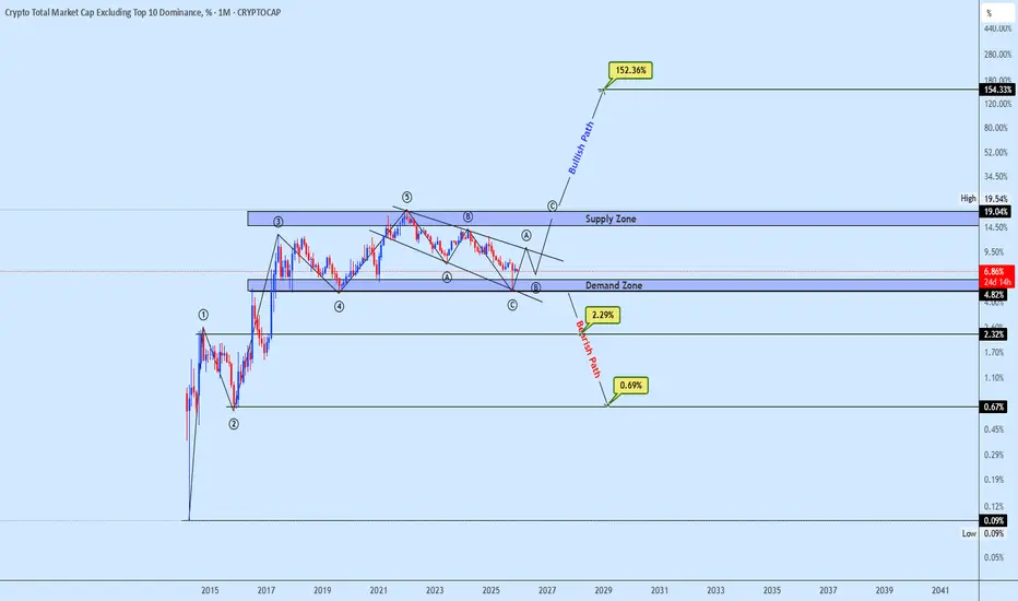 The crypto dominance excluding the top 10 assets price is sitting directly on a long-term demand zone that has generated strong reversals in previous cycles. After completing a 5-wave advance and forming a complex ABC correction, the market is now testing this structure once again.