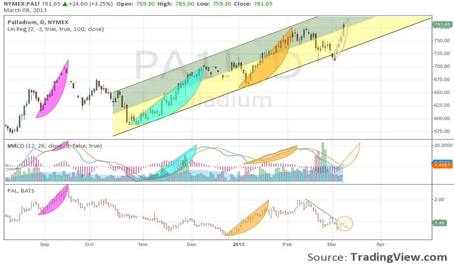 This is a chart of palladium with some recent breaks to the upside highlighted and the palladium play PAL at the bottom. I would like to thank JR for showing me this play. Not sure this is the big one but a move north it is. Looking back crossovers in the MACD have usually lead to big moves in this metal. We have a crossover now and PAL is following with a breakout of it's own.