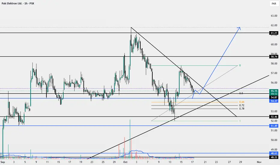PAEL is showing early signs of a bullish reversal on the 1H timeframe. After a strong corrective phase, price has respected the 0.66–0.72 Fibonacci retracement zone near 54.3–54.8, forming a short-term higher low structure.