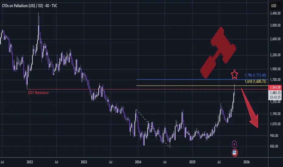 Palladium may chop, however it often dumps hard when it swings bearish - I doubt it can take out this candle wick high - and even if it did then it would still be very bearish.
