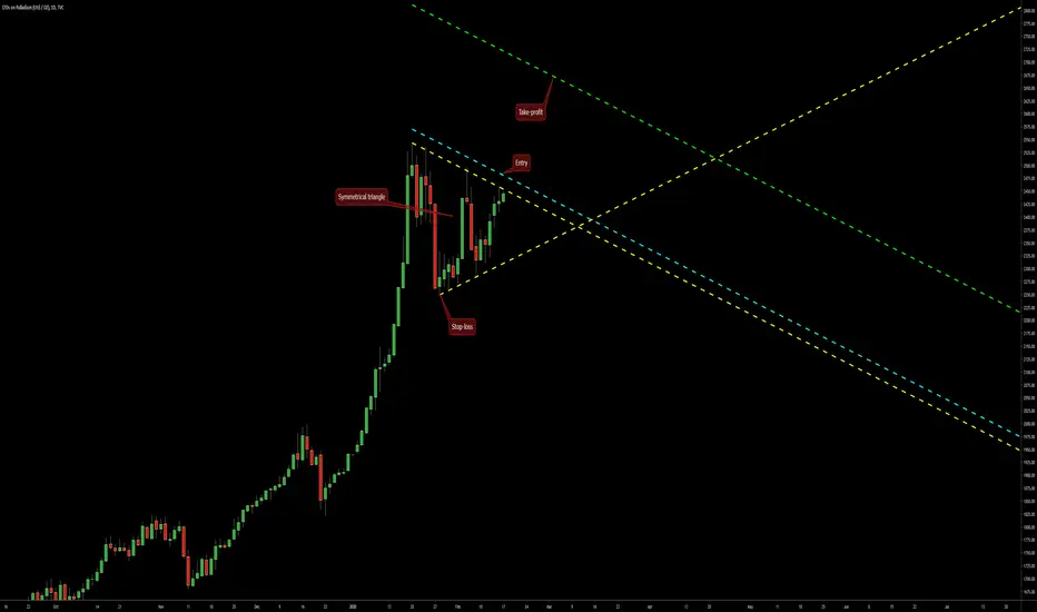 The symmetrical triangle on this daily chart of Palladium CFD offers an upside breakout trading opportunity. The triangle's borders are drawn using the yellow lines. My potential entry level will be at the cyan line. My potential take-profit level will be at the green line. I will use the low of the triangle's base as my stop-loss level (2249.0).