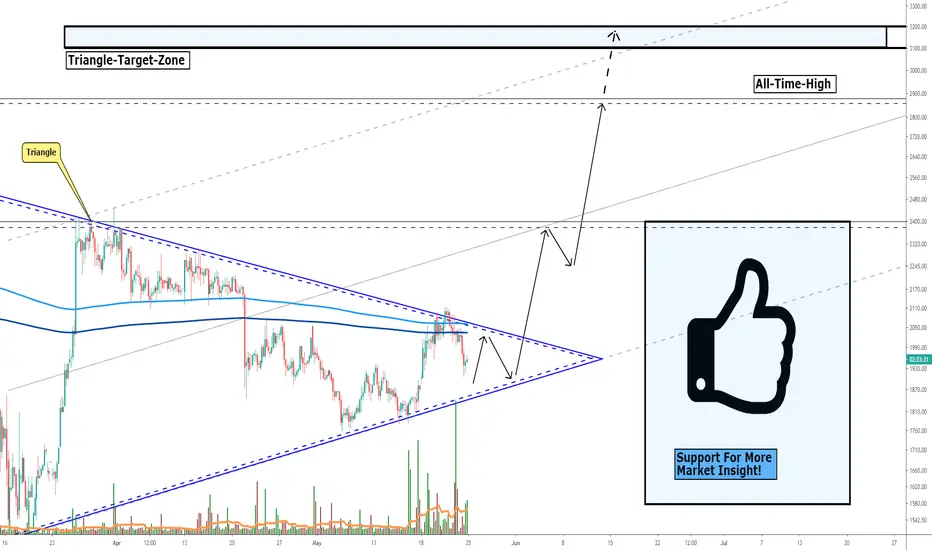 After the triangle has confirmed properly we can expect palladium to test its higher levels, firstly it will be the middle line of the channel as you can see it in my chart when the price and trend stay stable in this region we can expect palladium to move higher at least testing the higher boundary of the uptrend channel and the all-time-high, as you can see the all-time-high is just slightly below the overall triangle target when this target is finally reached it can provide a new all-time-high which will be extremely bullish and can catapult palladium to next highs.