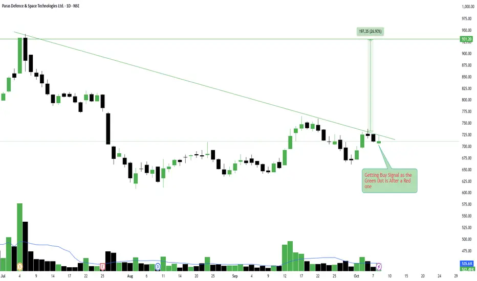 Paras Defence is flashing an early buy signal as the green dot (buy confirmation) appears right after a red one (sell exhaustion), suggesting momentum reversal might be starting.