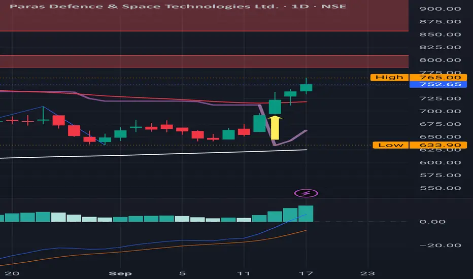 Paras Defense: After a Buy Signal, rally continues. Slowly approaching towards major Red Band resistance level.