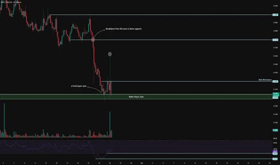 🧮 On 4-hour timeframe RSI OscillatorFrom a timing perspective, after losing the 0.1419 floor, the coin has been under intense selling pressure for 2 days. It is currently emerging from the oversold zone, sitting just below the 50 resistance level. Key areas remain at 30 and 21; a cross below 30 could generate a volatility-driven target near 21.