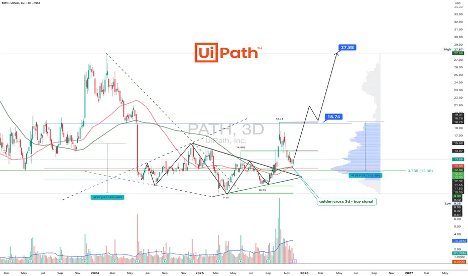 PATH is trading at 13.86 after the diamond pattern completed a clean breakout toward 18.74 and shifted into a corrective phase. The pullback landed precisely in the Fibonacci 0.786 zone between 12.00 and 12.50 where a clear demand area formed. Buyers reacted sharply and the three day chart printed a golden cross through the MA50 crossing the MA100 which strengthens the bullish scenario.