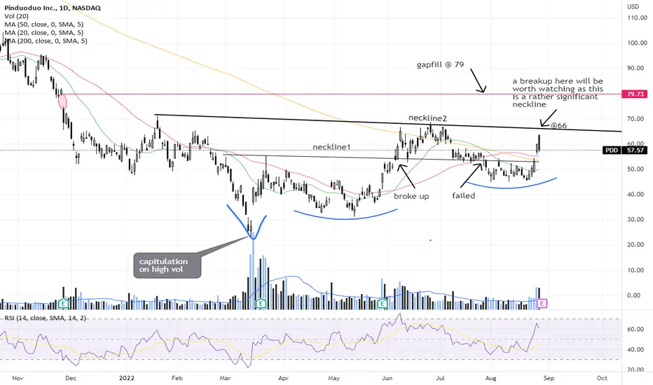 PDD had an earlier breakup of an Adam & Eve formation (@ neckline1) that subsequently failed. It is now approaching a more significant neckline (neckline2) and the earnings that is expected out soon could give a clue if the worst over and if the stock is on the way to propel higher, especially if it could continue to hold above the 200 day Moving Average. Let's see!