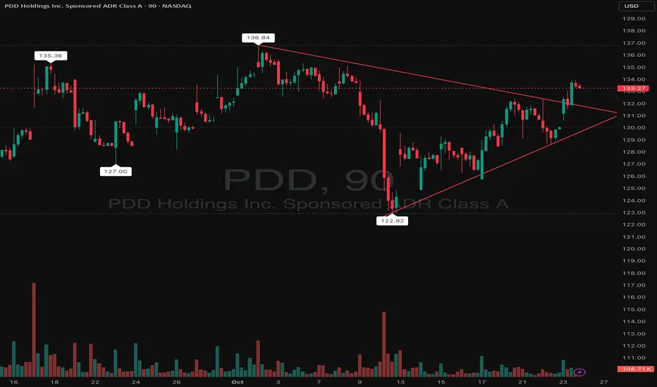PDD Holdings (PDD) is trading within a symmetrical triangle pattern on the 90-minute chart, showing consolidation after recent volatility. The stock has been forming higher lows from $122.92 and lower highs from $136.84, tightening into a decision zone.