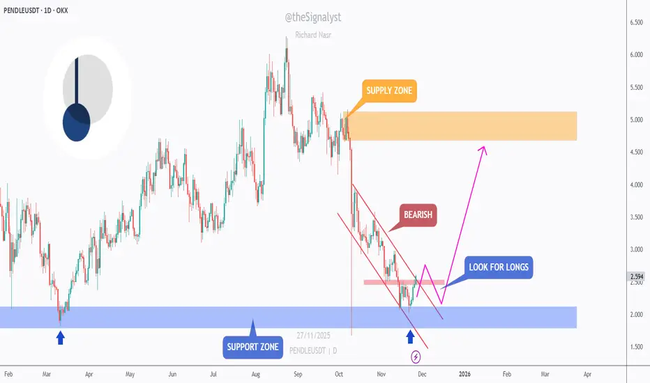 📉PENDLE has been bearish for weeks, sliding inside a clean falling channel. But price is now reacting from a major support zone, the same area that initiated previous strong rallies earlier this year.