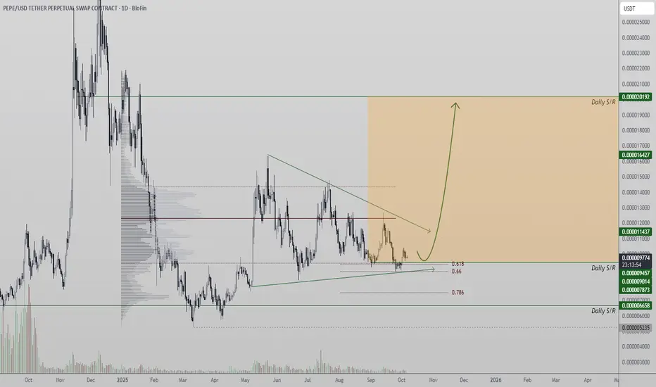 PEPE is approaching a decisive breakout point as it compresses within the apex structure. A breakout above the POC or daily resistance could trigger a bullish rally toward the value area high. As long as price holds above the 0.618 support zone, the probability favors an upward continuation in the short to mid-term.