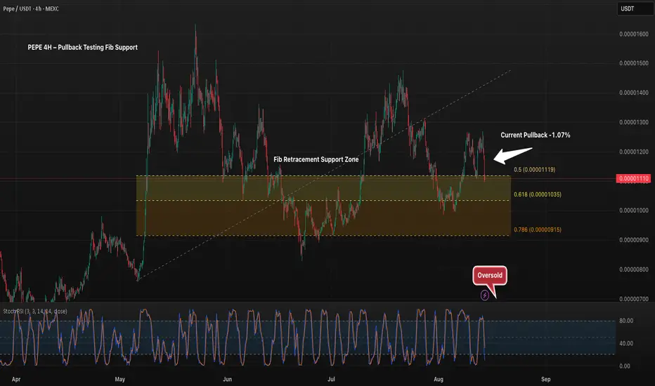 PEPE’s 4H chart shows price pulling back into the 0.5 Fibonacci retracement level near 0.00001119, with the next supports at 0.618 (0.00001035) and 0.786 (0.00000915). Stoch RSI is in oversold territory, signaling potential for a short-term bounce. A sustained hold above the 0.5 level could keep bullish momentum intact, while a breakdown increases risk of deeper retracement.