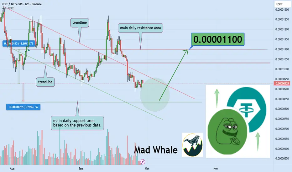 PEPEUSDT is trading between two key daily trendlines acting as support and resistance; if it breaks above the upper trendline while holding support, a potential 18% upside move could target 0.000011. 📊🚀