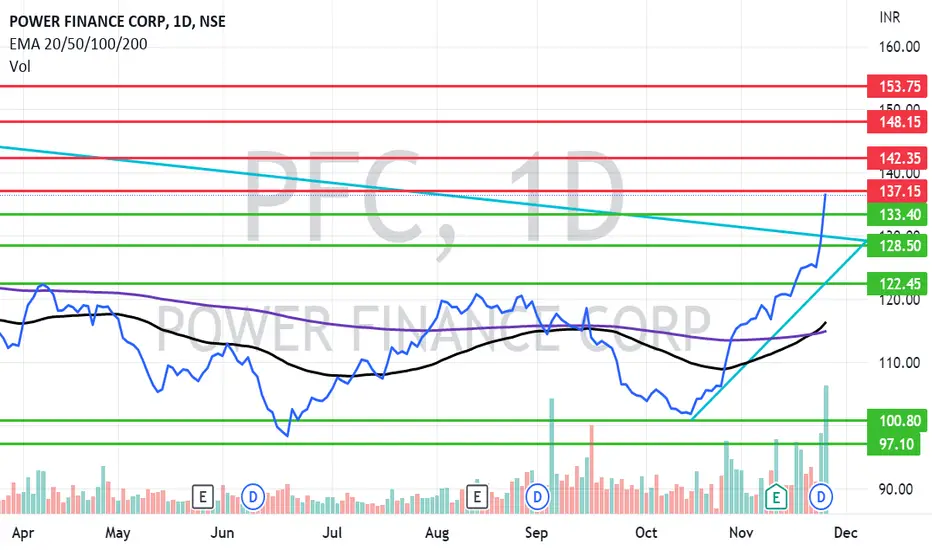 Entry / Compounding / Averaging in PFC can be done after closing above 138 closing. The target for PFC will be 142, 148. Long term target in the stock will be 153. Stop loss in the stock can be maintained at a closing below 122.