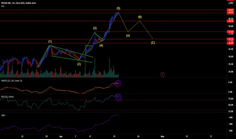 JNJ has earnings before market open tomorrow and may see PFE sympathy play from them depending which direction they go. PFE looks like it wants to head higher but all the technicals are suggesting otherwise. I already scaled into some puts but I wouldn't be surprised if we gap up to $39 area before coming back down. Let me know what you think!
