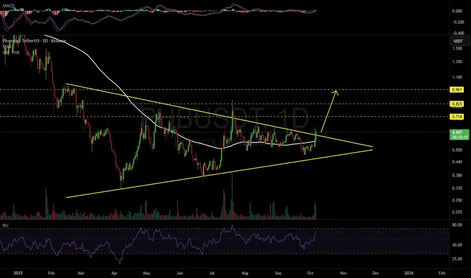 #PHB has broken above the symmetrical triangle resistance and the SMA100 on the daily chart. The increasing volume is a positive sign. If it manages to close the daily candle above the triangle, the potential targets are: