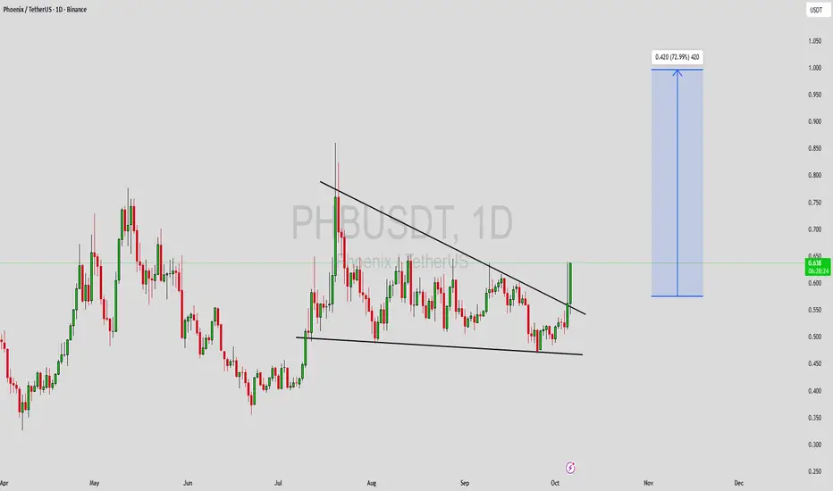 PHBUSDT is currently displaying a classic falling wedge pattern on the chart, a strong bullish signal that often indicates a trend reversal. After a prolonged consolidation phase within tightening support and resistance lines, the price seems to be preparing for a breakout to the upside. The good trading volume confirms that accumulation is underway, and buyers are gradually gaining control over the market. Once the breakout is confirmed, the momentum could push PHBUSDT toward significant upside targets, potentially delivering gains of around 60% to 70%.