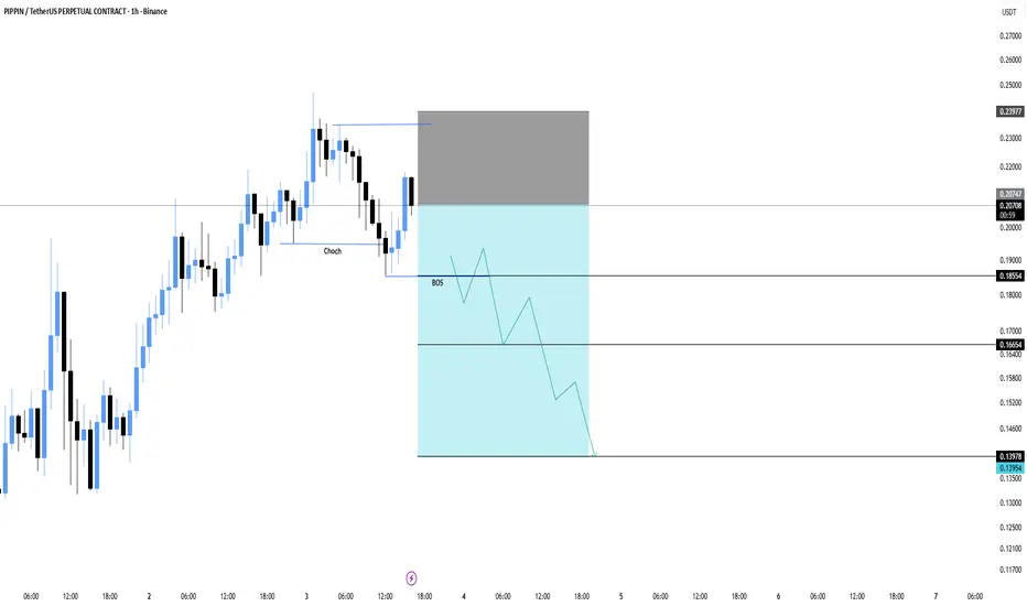 Price has shown a clear CHoCH followed by a BOS, confirming bearish structure. Current move is a retracement into the supply zone, giving a straightforward continuation-short opportunity.