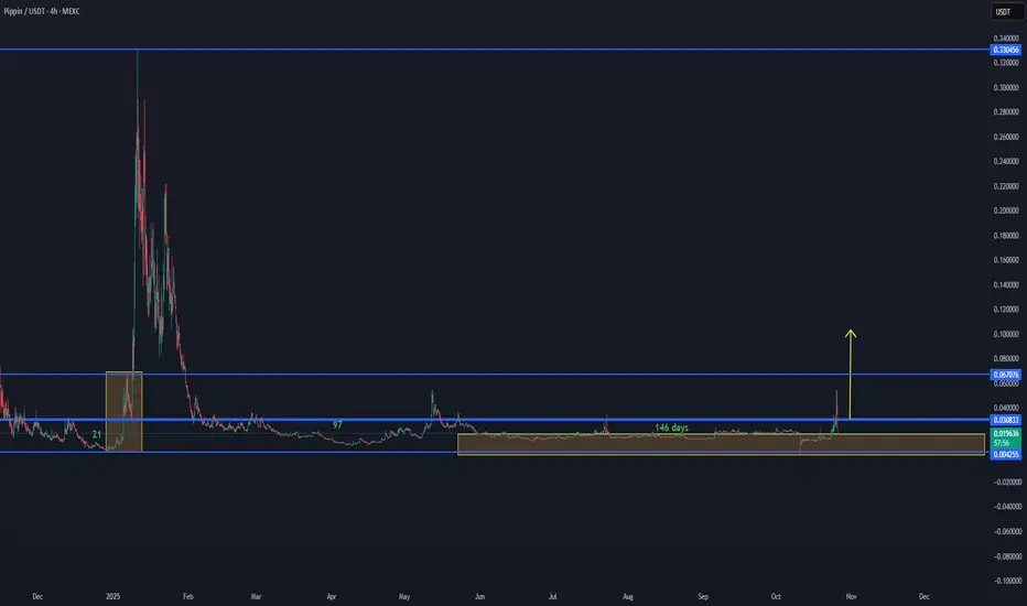 PIPPIN:USDT is showing early signs of new volume activation after an extended 146-day accumulation period within the lower range between 0.0042 – 0.0308 USDT.