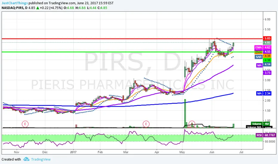 $NASDAQ:PIRS catching some short covering perhaps near end of the day, sending it up near the critical 5 area. Low 4s held very well after a month long run and consolidation. Expecting this to breakout over 5 barring any extraordinary news; not following company details but certainly ripe for a catalyst. Wouldn't be surprised with upgrade ratings or purchase disclosures in the coming weeks that may drive it further in the near-term.