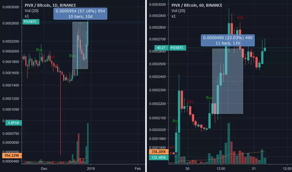 Top coin today at Binance is PIVX with 30% gain. Buy signal generated by new indicator X1 today using 1hr timeframe, possible gain of 23%. On longer timeframe of 1day, buy signal was generated 10days ago, possible gain of 57% today.