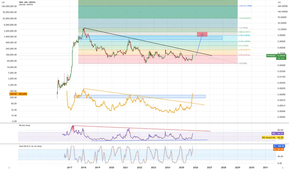 PIVX another from Dino coins that had long correction phase and is now showing signs of strength. Pattern is similar to ZEC before it broke out major diagonal resistance line. I expect same move from PIVX with initial push going to fibb 0.886 range where if we form support above 2.5-3.0$ we open path to higher targets.