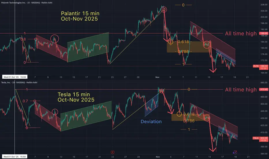 So why focus on fractals? I'm driving a point home and I hope you get it. These Tesla/ Palantir "fractal" charts should trigger questions like, "how is it possible for these 2 random assets to basically have the same price action (at the same time) over a 5 week period (on a 15 minute time frame & the 1 day"?