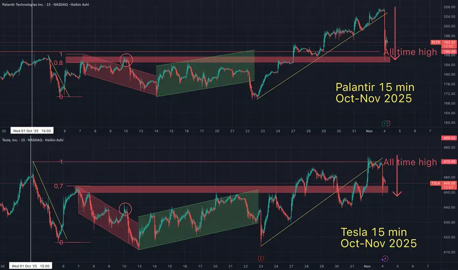 On Oct 7th I suggested the Palantir / Tesla "fractal" would lead them both to an all time high. Fast forward to today (1 month later), Palantir has recently hit a new ATH and Tesla is still following the fractal closely. I believe Tesla is days or weeks away from an ATH.