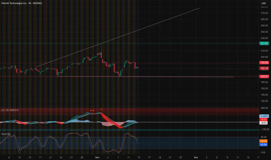 On the 4H chart, PLTR keeps retesting the same liquidity band near 182–184 — the same region where prior BOS and CHoCH levels formed. This zone is acting like a quiet anchor.