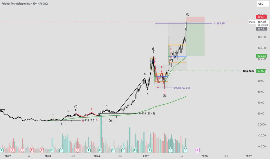 Palantir has experienced a remarkable rally since its April lows, surging to its current price levels. Throughout this uptrend, I’ve been analyzing the movement through the lens of Elliott Wave Theory. Given the stock’s relatively limited price history, the wave structure has been notably straightforward and discernible.