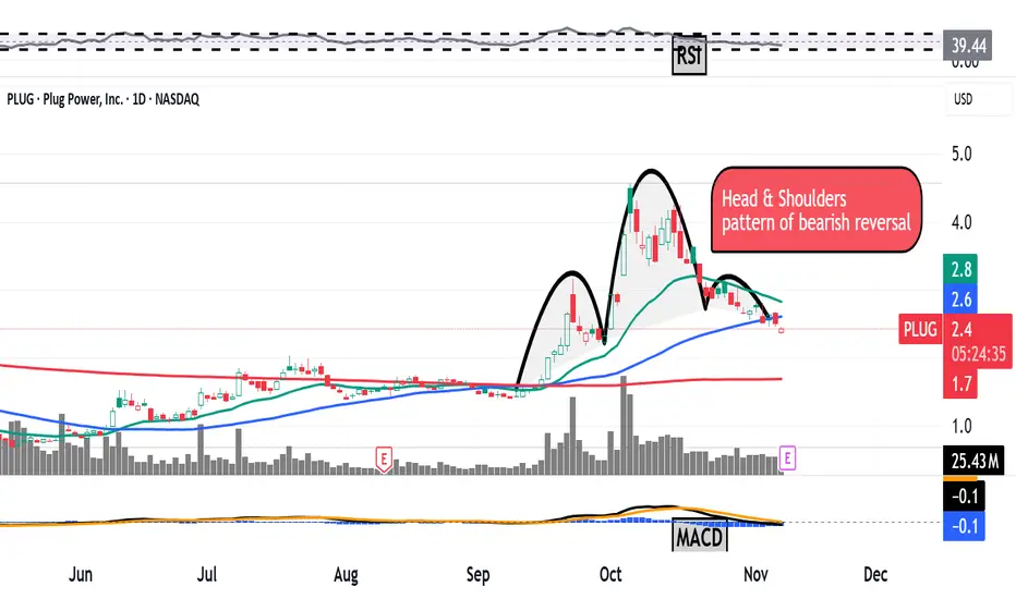 I noted the last time I wrote about PLUG that the stock seemed to be forming a head-and-shoulders pattern of bearish reversal, and the chart above shows that this has only developed further in recent weeks.
