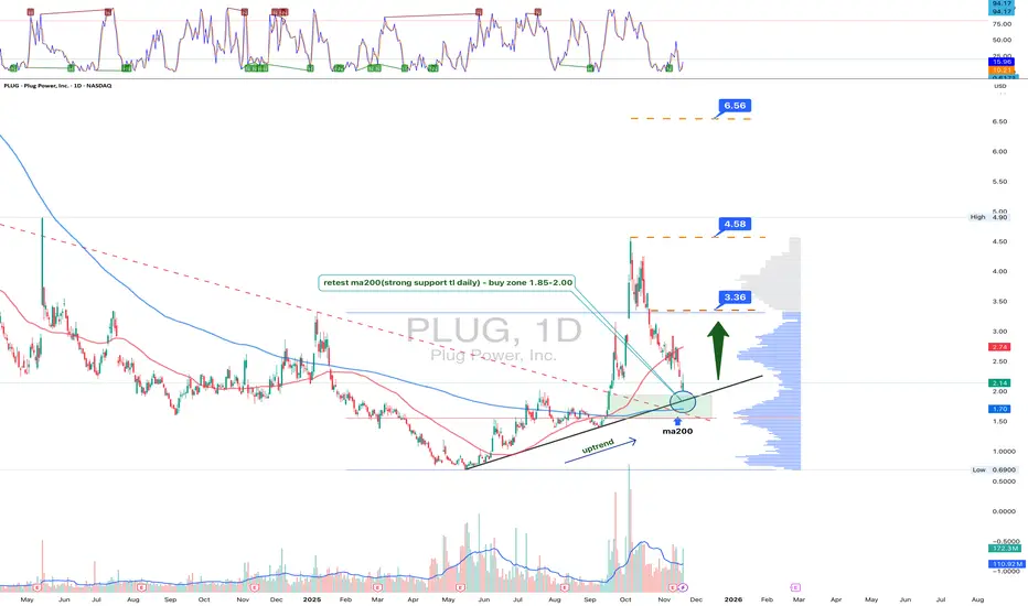 PLUG tapped perfectly into the 1.85–2.00 zone - a clean confluence of the MA200, the ascending daily trendline, and the main support that launched the summer rally. Oscillators dipped into oversold, candles show buyer tails, and volume confirms defense of the level. As long as price holds above the trendline, the bullish scenario stands: breaking above 2.70 opens 3.36, and a move above 3.36 targets 4.58. The extended target at 6.56 requires a full breakout from the broader accumulation range.